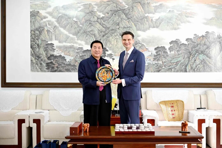 2025年11月21日,乌克兰驻华大使馆特命全权大使亚历山大·涅奇塔伊洛、二等秘书杰尼斯·梅尔兹溜克一行到访河北外国语学院。河北外国语学院董事长、校长孙建忠院士热情接待代表团,双方就深化教育文化交流合作展开深入交流。
